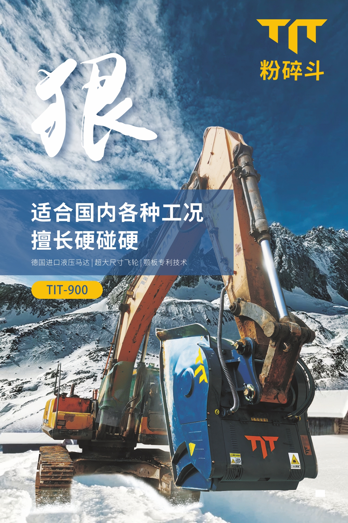 TIT粉碎斗,也稱破碎斗,顎式破碎斗,是一款創新型挖掘機屬具,掛于挖掘機大臂上,可快速將工程惰性材料破碎成極具價值的工程用料。